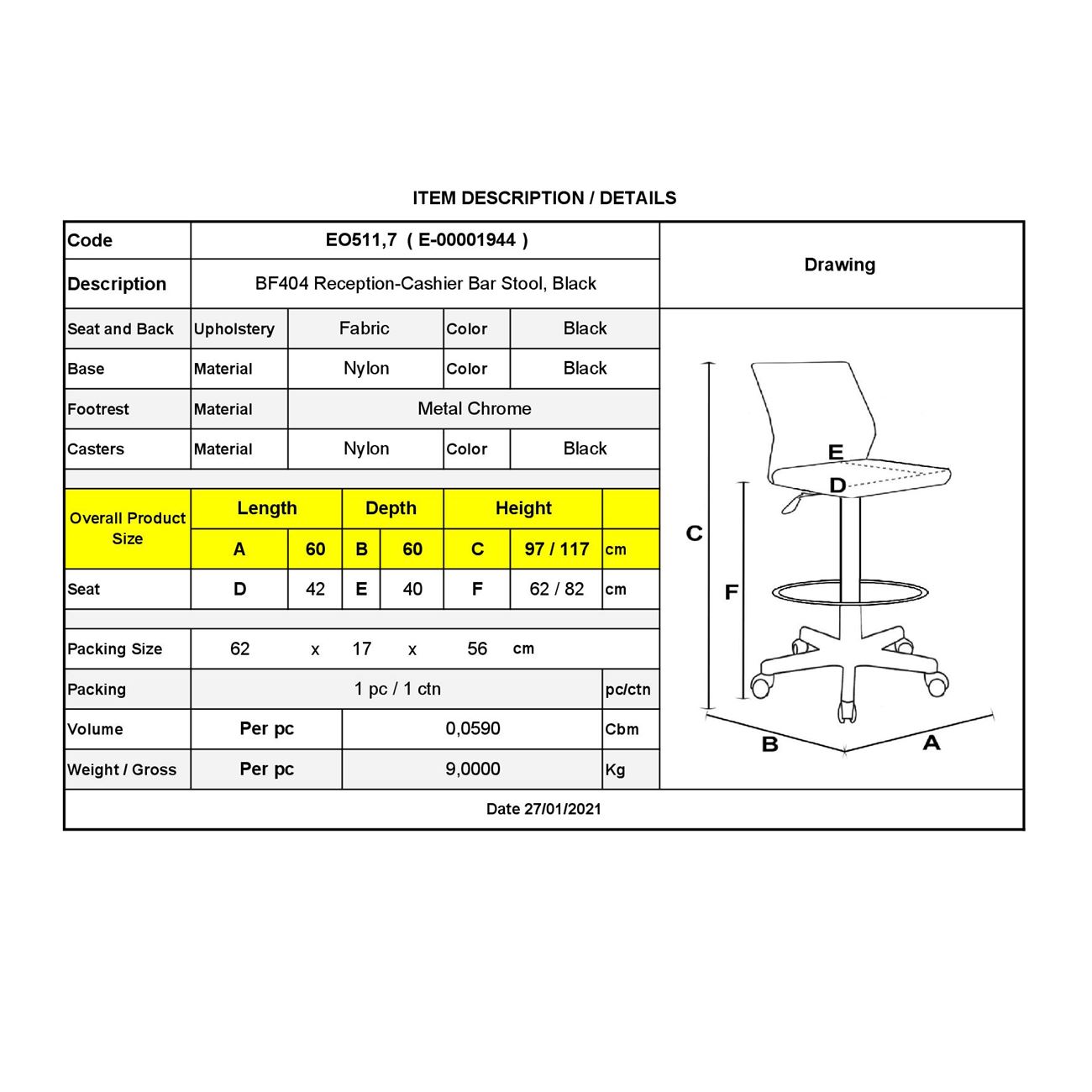 ΕΟ511,7 BF404 Σκαμπό Reception-Ταμείου, Μαύρο
