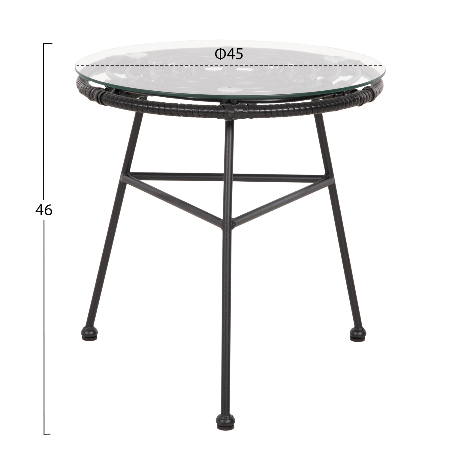 Επιστροφή στο ΚατάστημαΤο κοντό τραπέζι εξωτερικού χώρου FB95459.12 έχει ΜΑΥΡΟ μεταλλικό σκελετό με 3 πόδια. Το επάνω μέρος του σκελετού είναι επενδυμένο με συνθετικό Rattan σε ΜΑΥΡΟ χρώμα και σε κυκλική διάταξη, έτσι ώστε να τοποθετηθεί το στρογγυλό γυαλί ασφαλείας της επιφάνειας. Οι διαστάσεις του το κάνουν ιδανικό για μικρότερους χώρους, τόσο επαγγελματικούς, όσο και για το σπίτι.