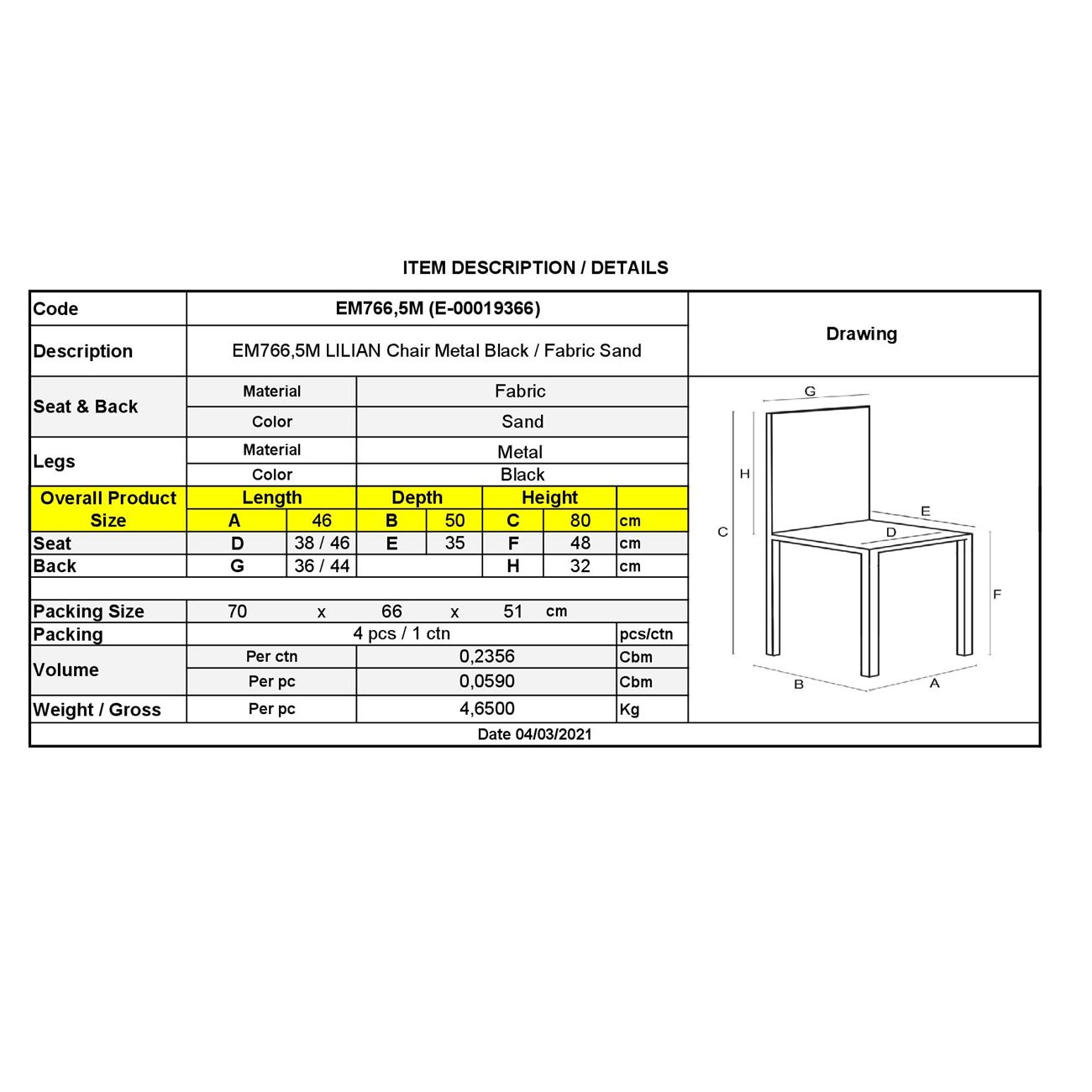 ΕΜ766,5Μ LILIAN Καρέκλα Μέταλλο Μαύρο/Ύφασμα Sand