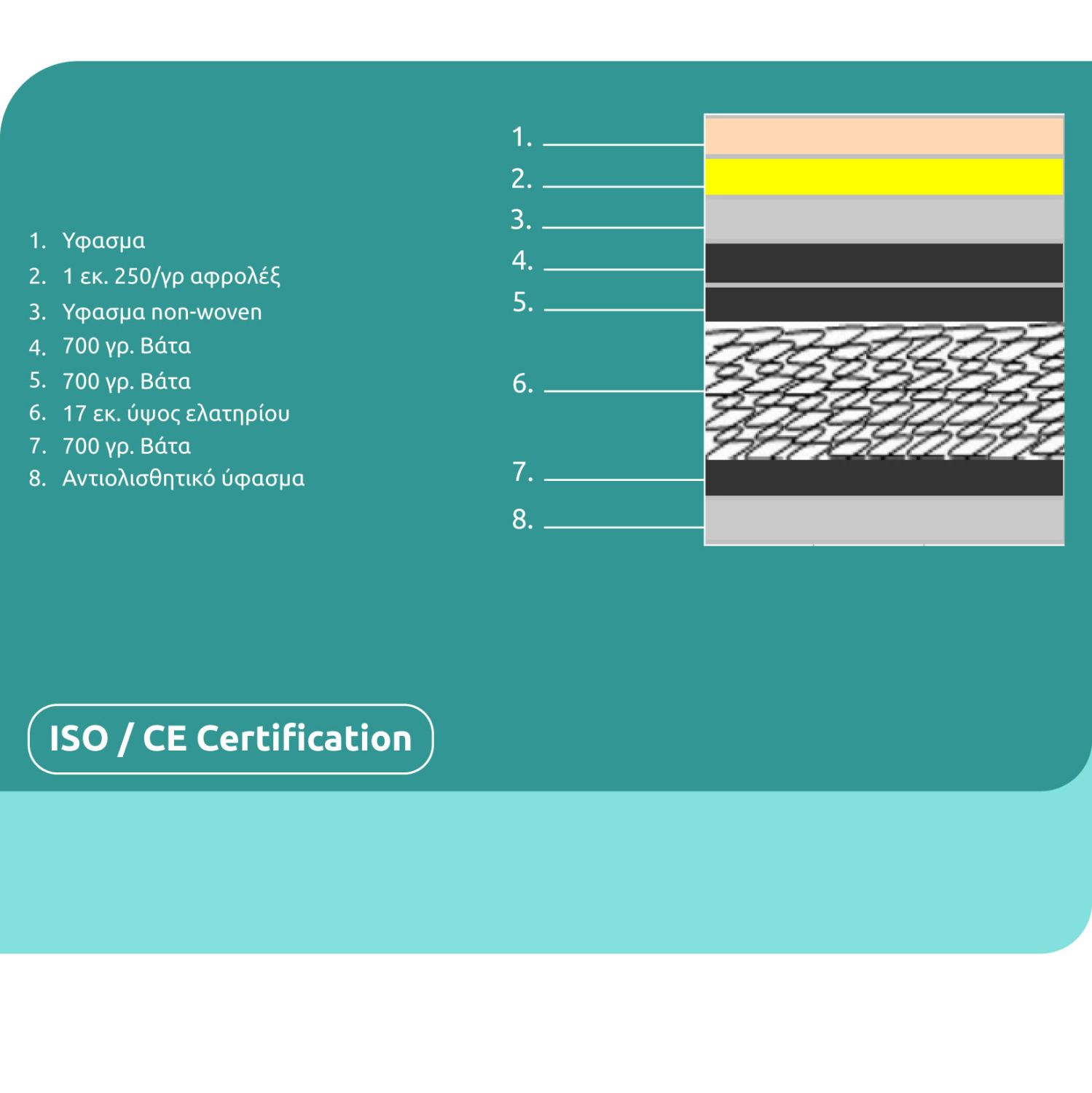 Στο κάτω μέρος του στρώματος υπάρχουν στρώσεις από σκληρό αφρολέξ και non-woven ύφασμα στο τελείωμα.